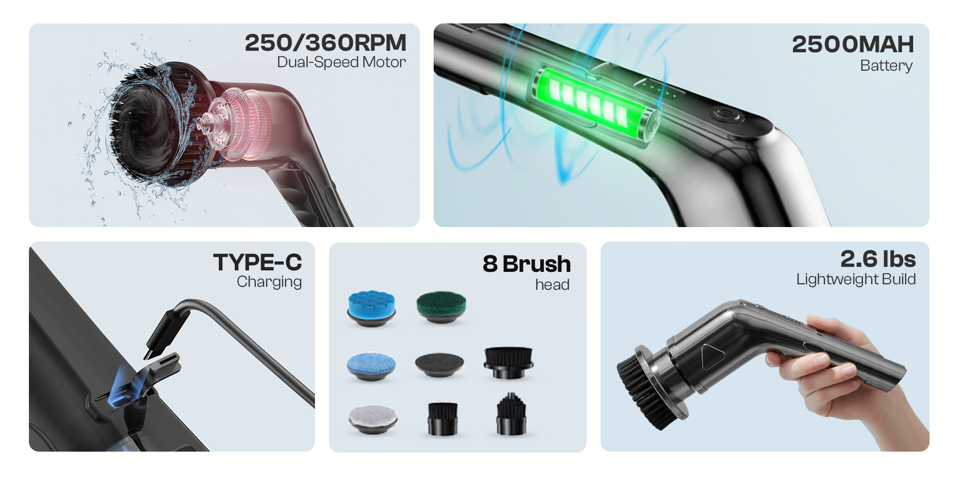 You’ll get 8 interchangeable brush heads, each designed for different cleaning tasks - from tiles and glass to kitchens and cars.