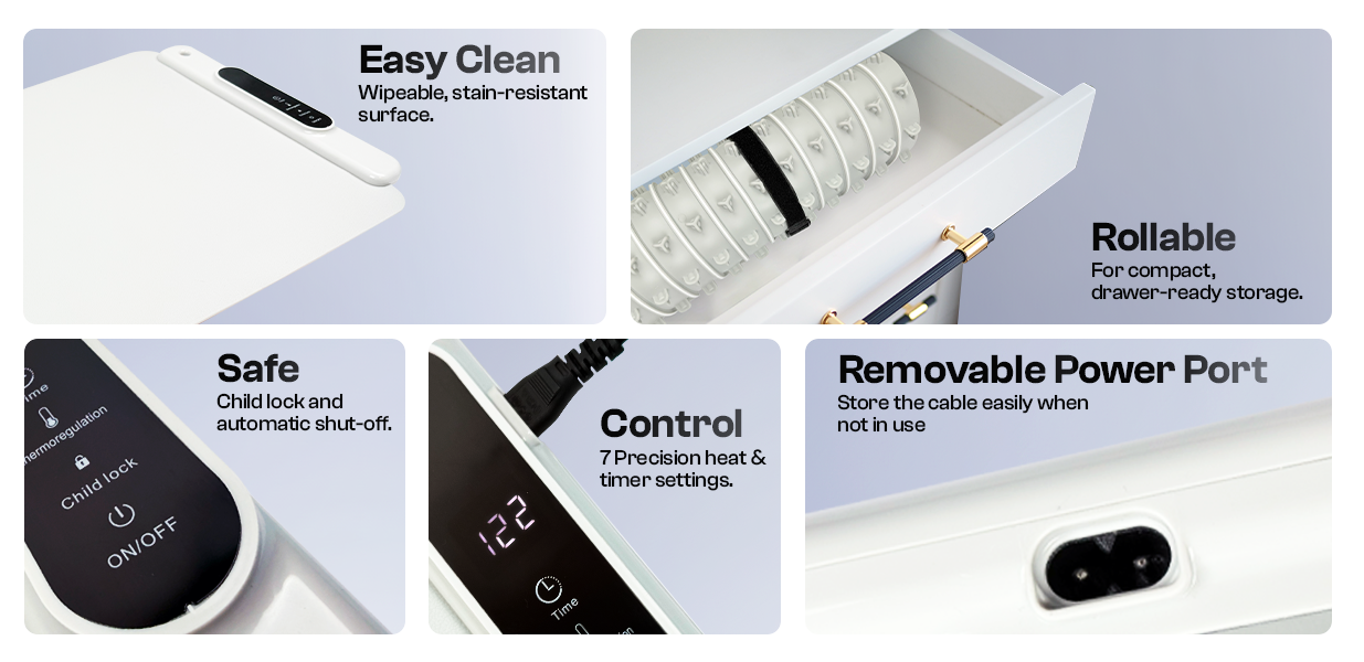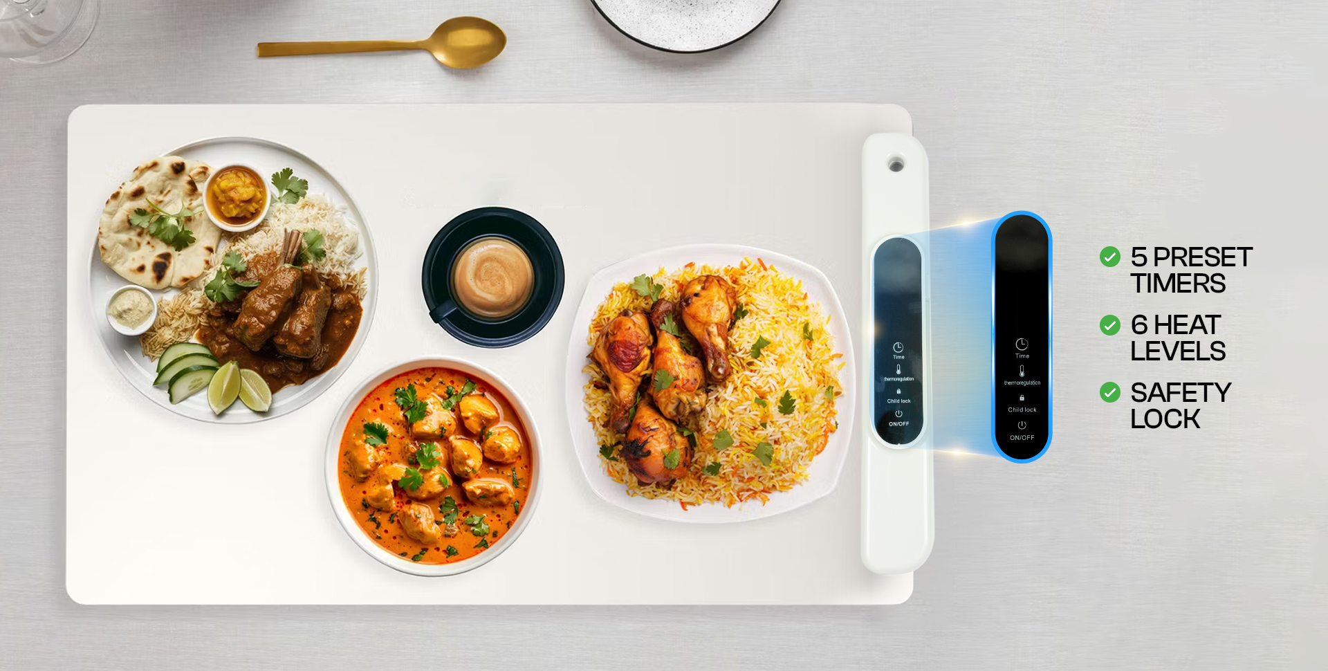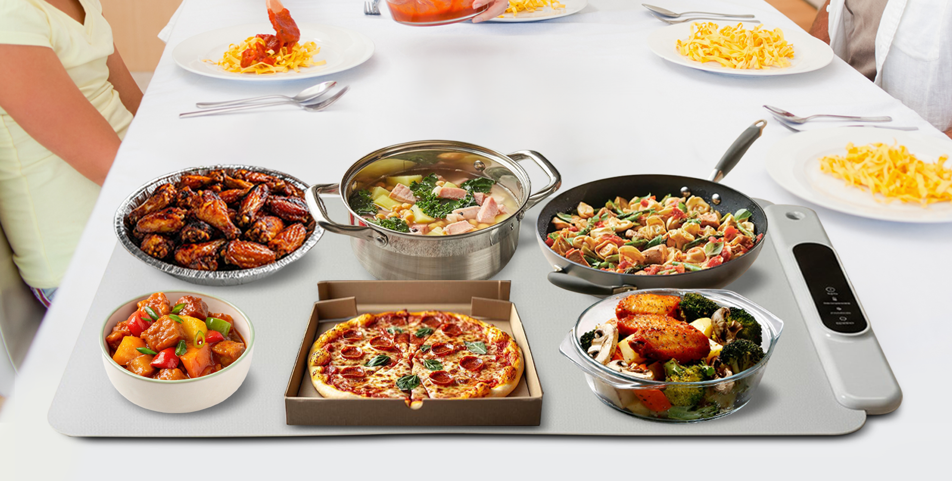 The mat features a 25.63 × 15.35-inch warming area, giving you plenty of room for multiple dishes at once. It handles large plates, serving trays, and family-size meals with ease, making it great for parties, buffets, or daily use.