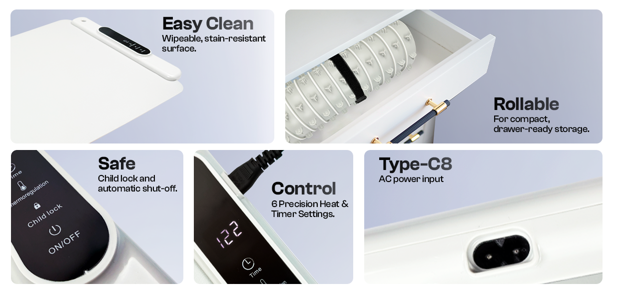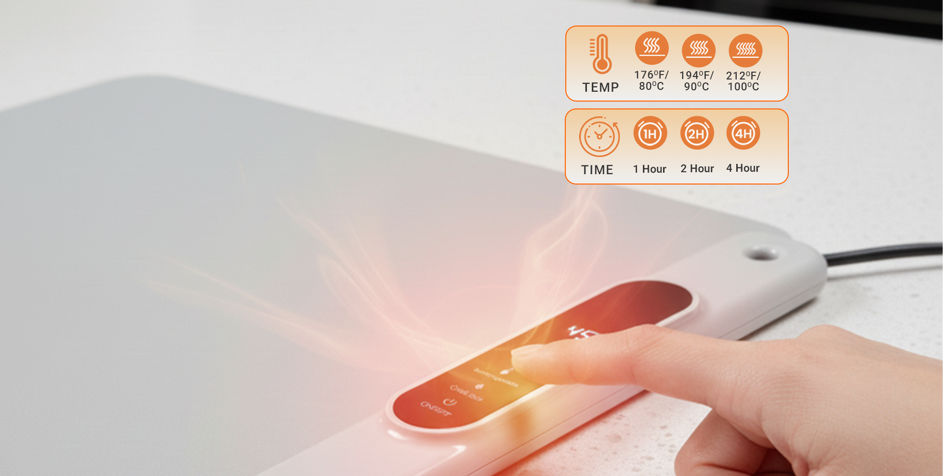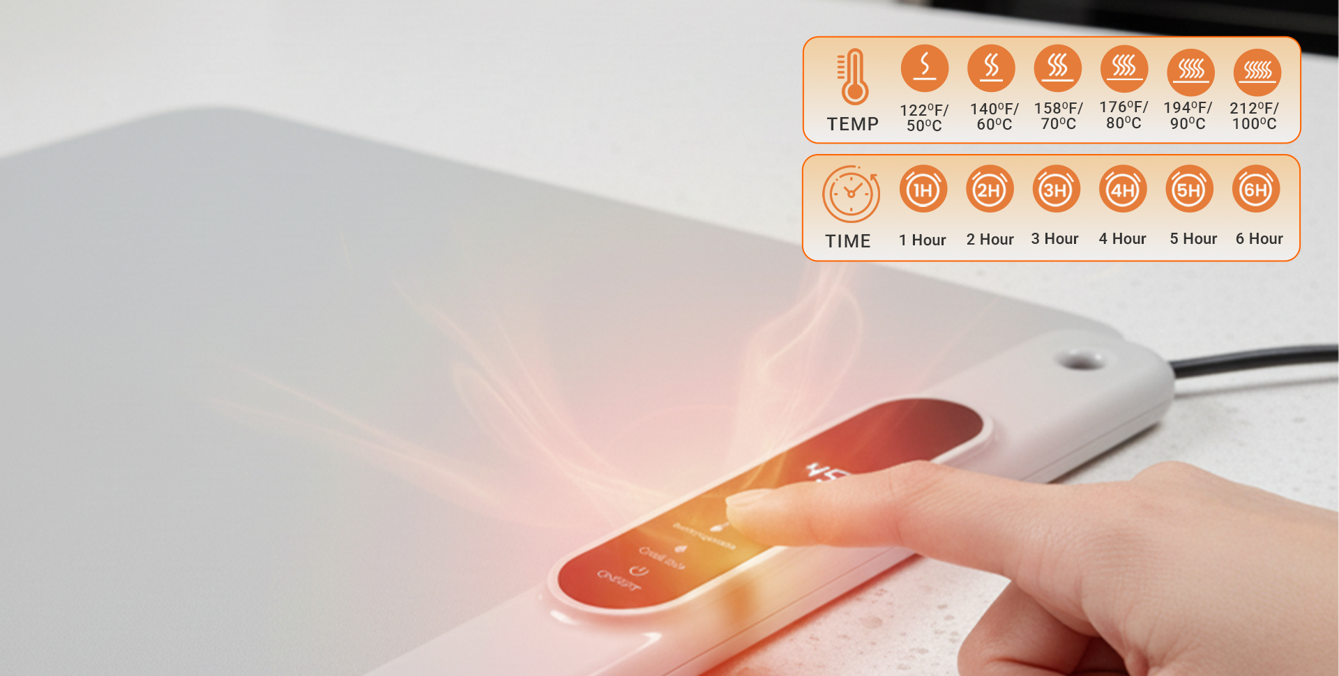 The mat features a 25.63 × 15.35-inch warming area, giving you plenty of room for multiple dishes at once. It handles large plates, serving trays, and family-size meals with ease, making it great for parties, buffets, or daily use.