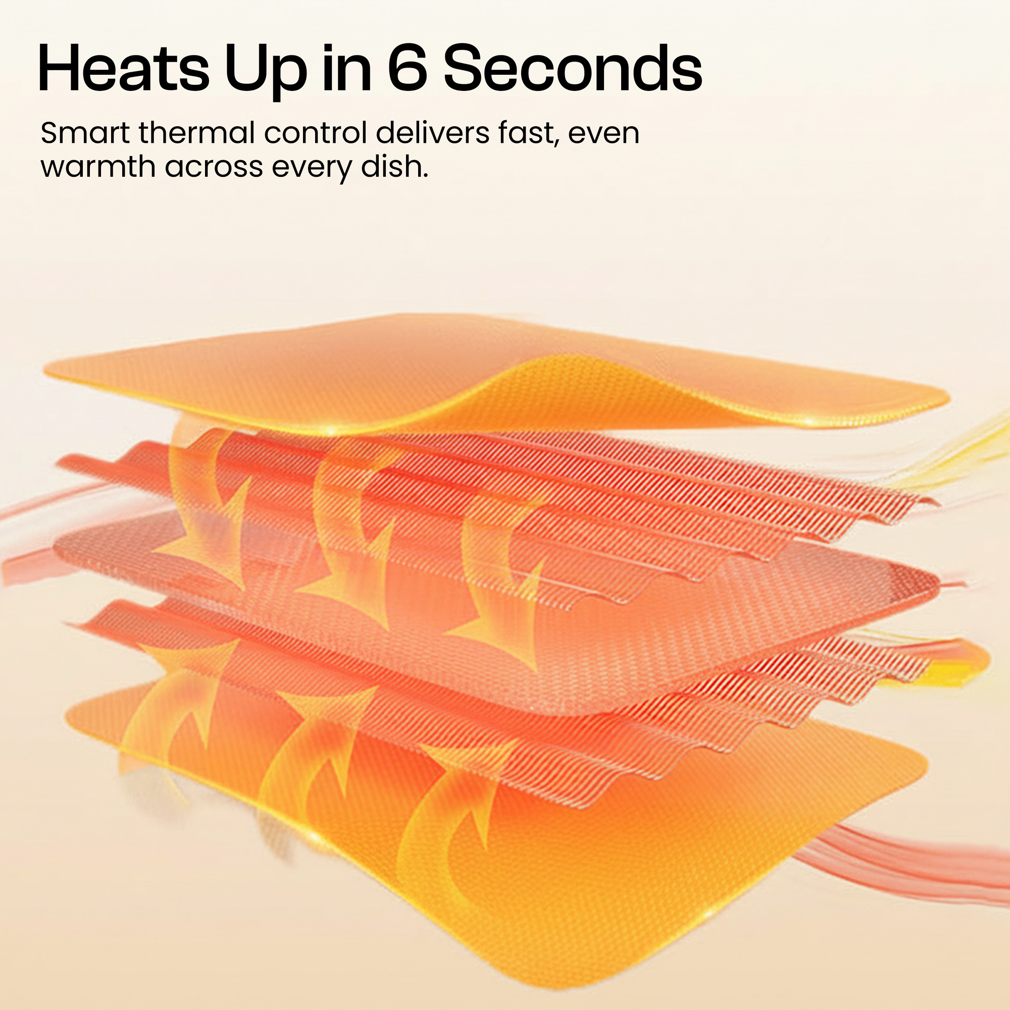 The mat features 300W rapid-heat technology. It reaches its target temperature in as little as 6 seconds, so you can go from plugging it in to keeping your food perfectly warm almost instantly.
