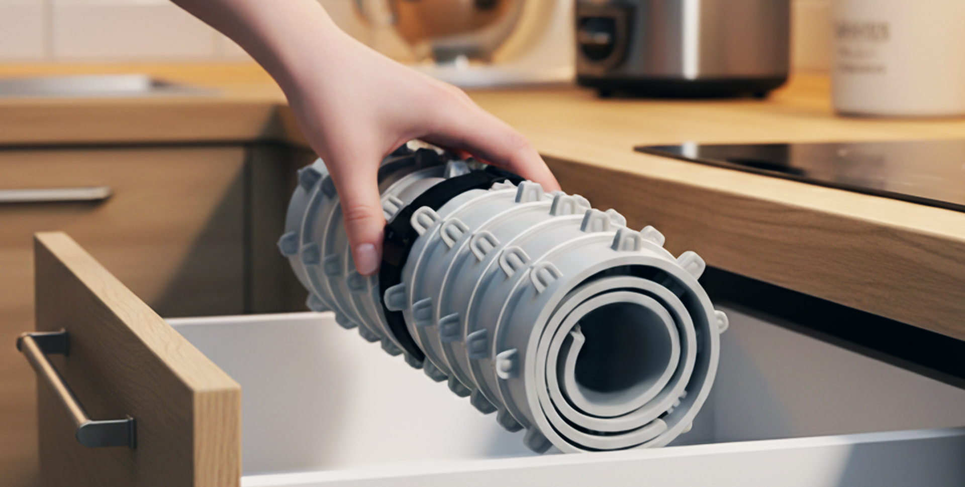 Simply let it cool, wipe it clean, and roll it into a compact cylinder. Use the included storage strap to keep it neatly rolled. It's designed to fit effortlessly into any standard kitchen drawer.
